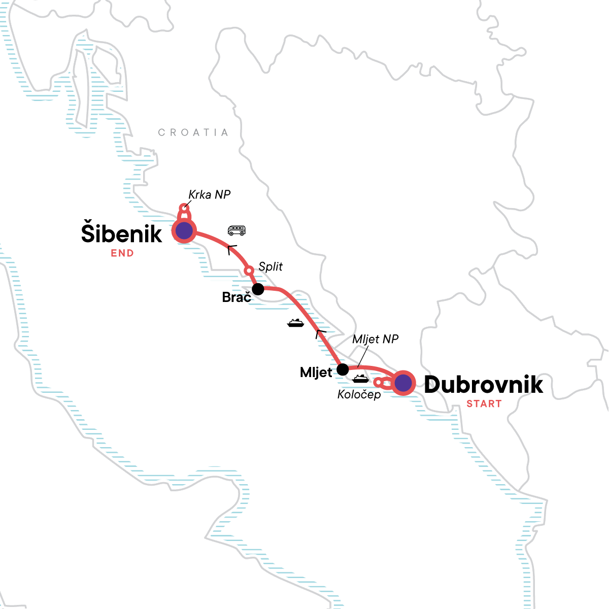 Your Welcome Moment: Welcome Meeting - Meet Your CEO and Group. Walk of Dubrovnik's old town. Coastal hike on Kolecep Island. Sea kayaking outside of the city walls of Dubrovnik. Hike with a local guide in Mljet National Park. Guided hike to the medieval village of Dol on Brač Island. Walk around the Diocletian's Palace in Split. Sightseeing walk of Šibenik. Hike along St Anthony's Canal trail. CEO-led hike in Krka National Park. All transport between destinations and to/from included activities
