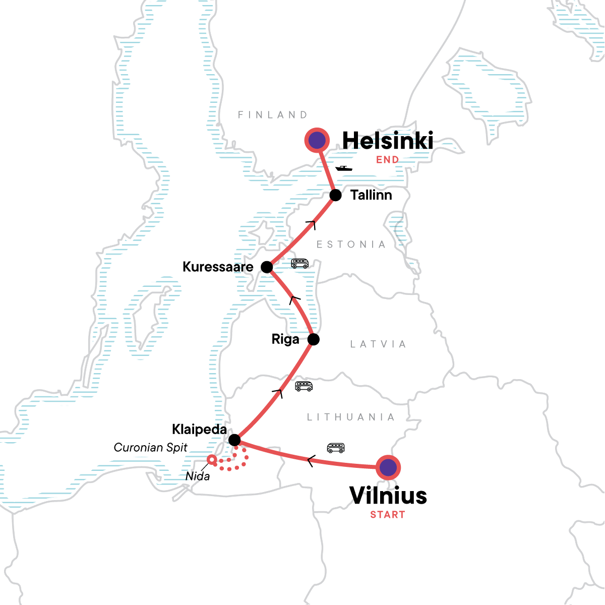 Explore the charming and enigmatic Baltic countries, Ride a bike around the coastal dunes of Lithuania's Curonian Spit, Picnic in beautiful Riga, Live like a local on a farm in Estonia, Wander the charming streets of Helsinki