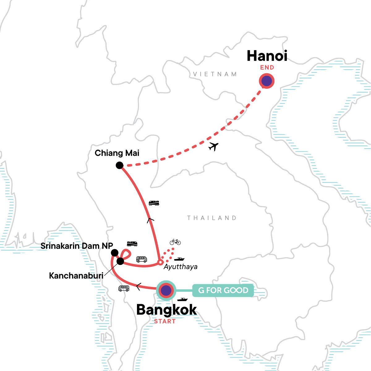 Your Foodie Moment: Street Food Dinner in Chinatown, Bangkok. Bangkok Klong Riverboat Tour. Visit Hellfire Pass and Ride the Death Railway. Visit Bridge on the River Kwai and Thai/Burma Railway Centre and Allied War Cemetery. Visit a Local Rice Farm. Ayutthaya Cycling. Boat Tour. Chiang Mai Old Town Orientation Walk. Chiang Mai Night Market Walk. Sunrise Alms Giving. Doi Suthep Temple Visit. Hanoi Old Town Cyclo Tour. Bia Hoi Corner and Microbrewery Crawl. All transport between destinations and to/from included activities.