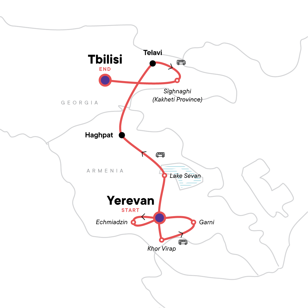 Your Foodie Moment: Lunch With A Local Family, Kakheti. Echmiadzin visit. Khor Virap visit. Garni Roman temple and gorge visit. Lake Sevan stop with visit to monasteries. Sanahin Monastery Complex visit. City tour of Tbilisi. Georgian Military Road drive. Mtskheta's UNESCO-listed churches visit. Jvari Monastery and Svetitskhoveli Cathedral visit. Hike to Uplistsikhe Cave. All transport between destinations and to/from included activities.