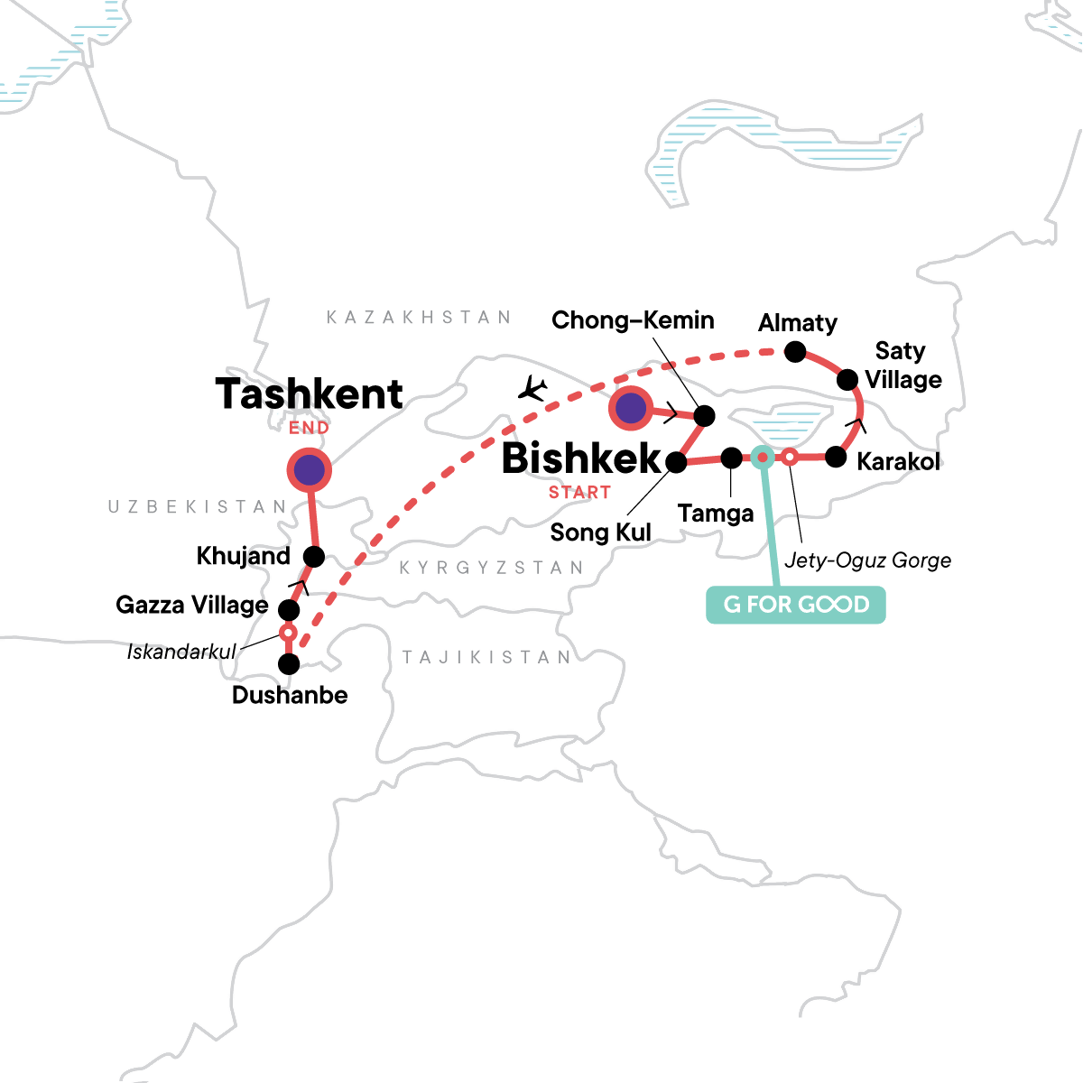 Your Local Living Moment: Community Guesthouse, Ghazza. Bishkek City Tour. Burana Tower. Home-cooked traditional dinner. Overnight in a Yurt. Free time in Chong-Kemin. Song Kul Lake. Lunch with Local Family in Kochkor. Skazka "Fairytale" Canyon. Tamga Village Stay. Yurt Building Demonstration. Jety Oguz & the Seven Bulls. Karakol City Tour. Russian Orthodox Cathedral. Dungan mosque. Saty Village Stay. 4x4 ride to Kaindy Lake. Charyn Canyon. Almaty City Tour. Independence Square, Zenkov Cathedral, Panfilov's Park. WWII memorial. Free time in Almaty. Dushanbe City tour. Alexander the Great's lake. Hike to Iskander Darya waterfall. Fann Mountains. Voru Village Hike and Blacksmith. Free time in Ghazza Village. Istaravshan Mosque and Lenin Bust visit. Khujand City Tour. Museum of Sughd. Mausoleum of Sheik Muslekheddin. Khujand market.