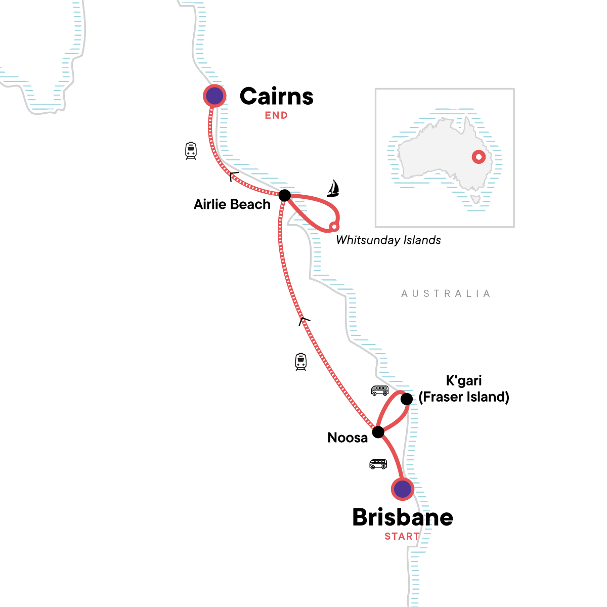 Enjoy the coastal beauty and vibrant atmosphere of Noosa's stunning beaches and national park, Discover the pristine white sands and crystal-clear waters of the Whitsundays on a day trip, Experience the natural wonders and diverse wildlife with an overnight stay on K'gari (Fraser Island), Explore the tropical charm and adventure activities of Cairns at your own pace