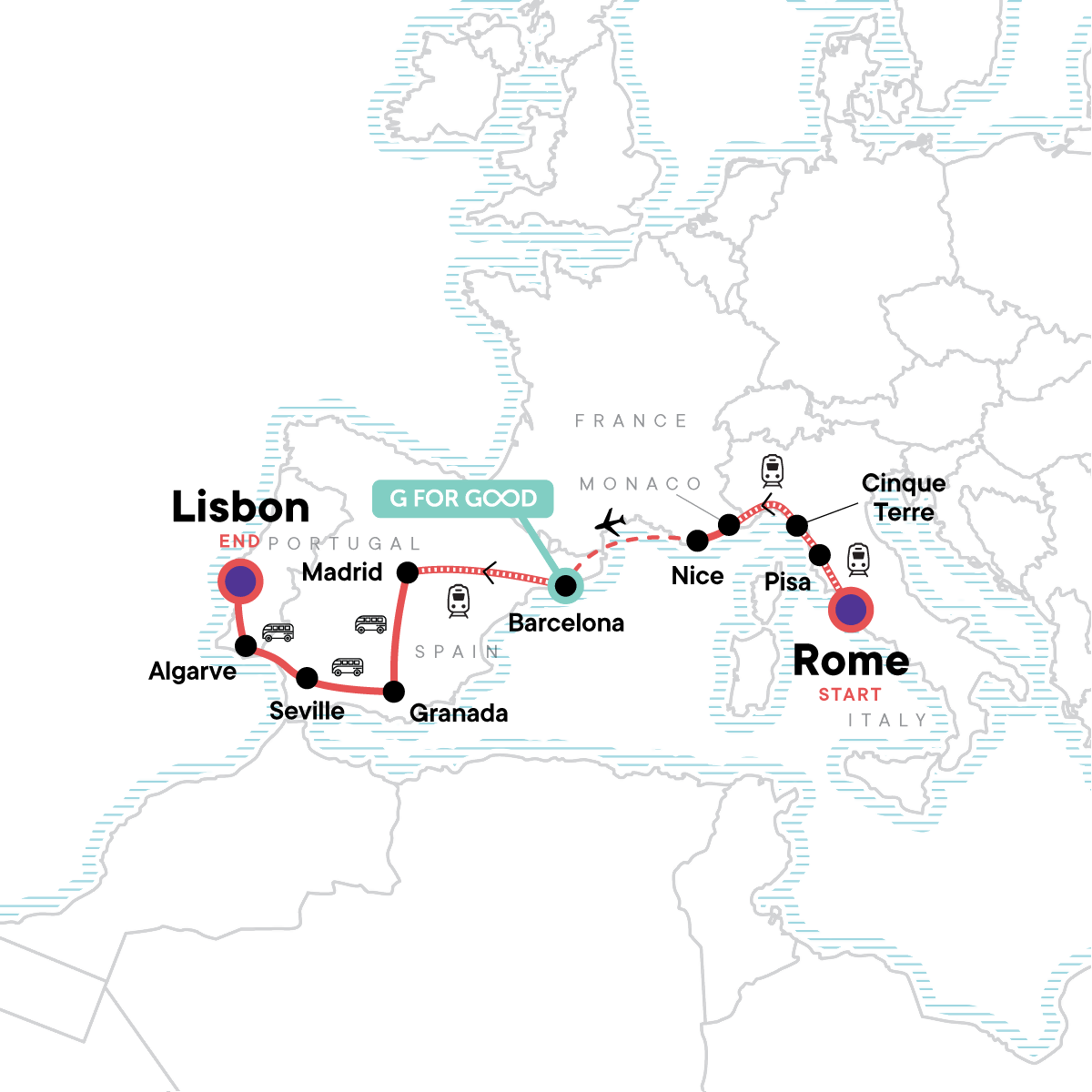 Your Big Night Out Moment: Lisbon. Visit to the Leaning Tower of Pisa. Cinque Terre park fee, unlimited train ticket, and CEO-led hike. Visit to Monaco. Tapas bar crawl (Granada). Free time on the Algarve coast (Portugal). Orientation walks in Barcelona, Granada, Lisbon, and Madrid. All transport between destinations and to/from included activities.