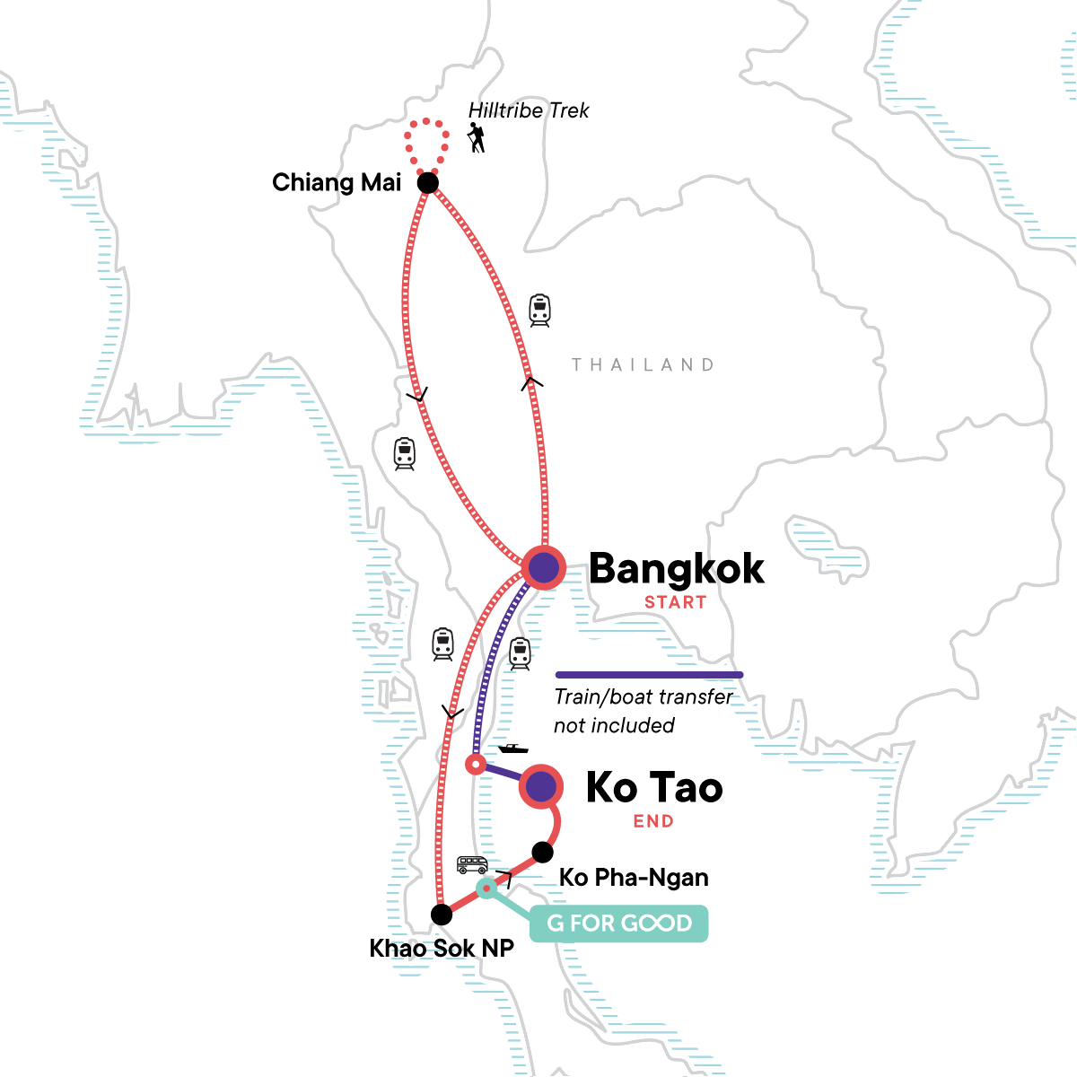 Your Big Night Out Moment: Beach Bar, Koh Tao. Visit to Chiang Mai night market. Hilltribe trek. Bamboo rafting. Street food crawl. Snorkelling trip (Ko Tao). All transport between destinations and to/from included activities.