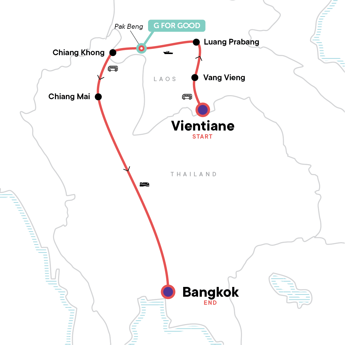Your Big Night Out Moment: Bangkok. Guided hike in Vang Vieng. Slow boat up the Mekong. Orientation walk, Wat Phousi sunset hike, Kuang Si Waterfalls excursion and street food crawl in Luang Prabang. All transport between destinations and to/from included activities.