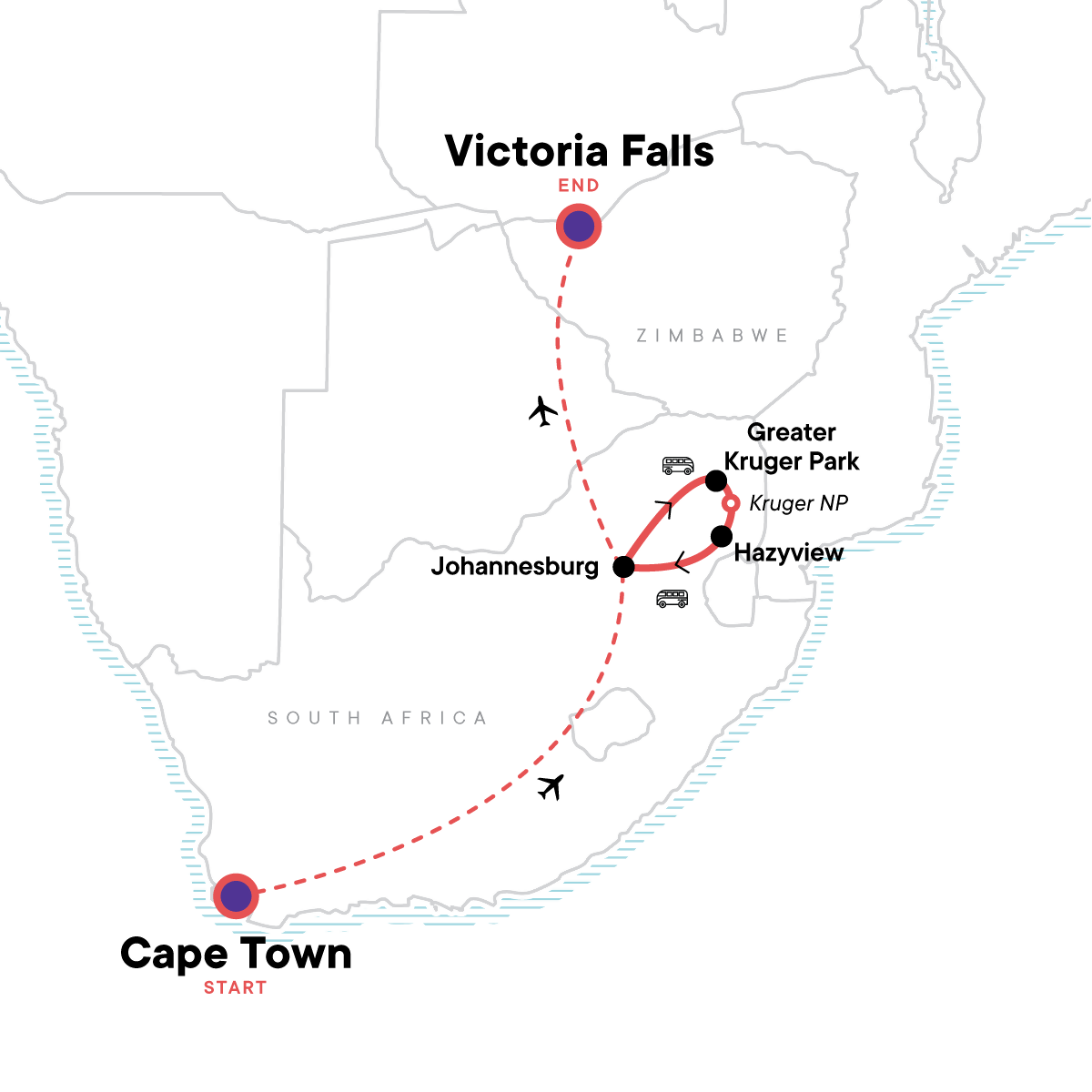 Your Discover Moment: Victoria Falls. Table Mountain cable car ride and visit. Nature Walk. Wildlife Safari Drive. Traditional Dinner and Local Dancing. Kruger National Park Open Vehicle Wildlife Safari Drive. Chimp Eden Tour. Simunye Theatre Show. Free time in Cape Town & Victoria Falls for optional activities in the area. Internal flights. All transport between destinations and to/from included activities.