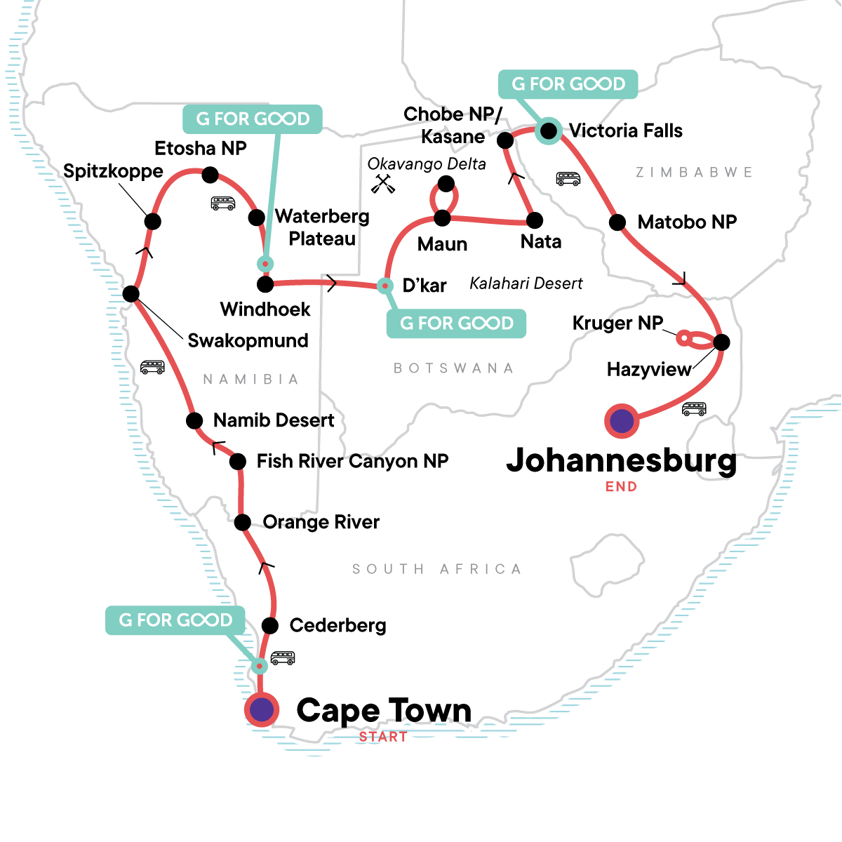 Spend 28 days cruising through Africa in a Lando (overland adventure vehicle) visiting towering sand dunes, deep canyons carved through time, and Etosha, Kruger, and Matobo National Parks for some unforgettable wildlife safari drives. Listen to the thundering roar of Victoria Falls, enjoy traditional dinner and dance, and campouts under a blanket of stars. Think action, adventure, and amazing wildlife encounters in a super continent of diverse ecosystems waiting to welcome you with open arms.