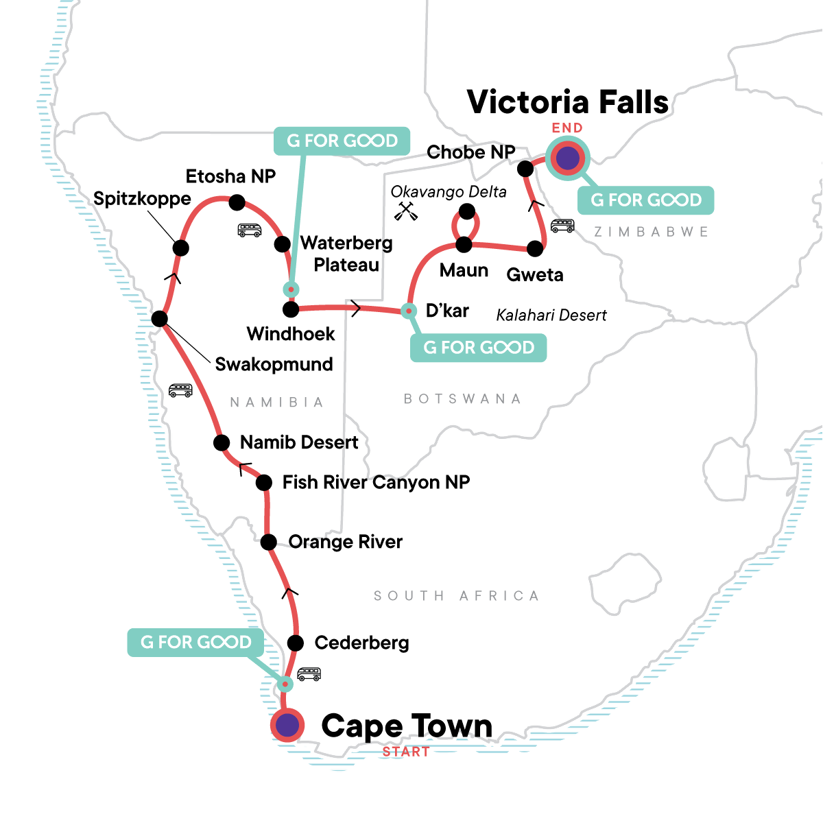 Your Discover Moment: Victoria Falls. Fish River Canyon, Sossusvlei Dunes, and Spitzkoppe entrance fees. Etosha National Park entrance with wildlife safari drives. Okavango Delta overnight bush camping excursion. All transport between destinations and to/from included activities.