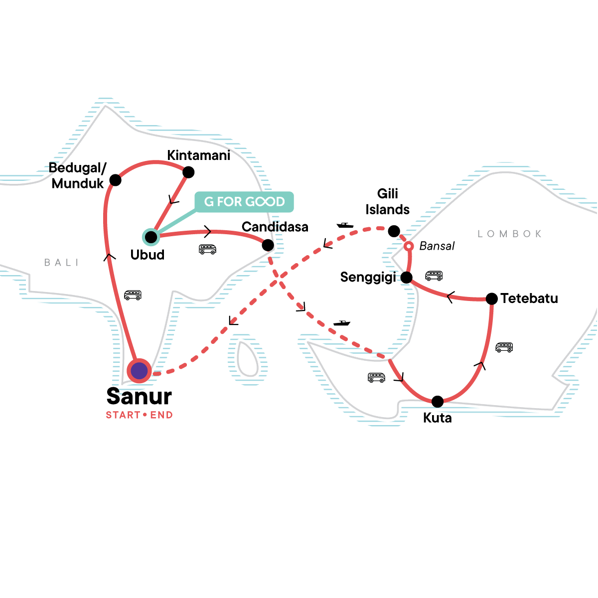 Your Discover Moment: Ubud. Beach time in Candidasa. Jatiluwih Rice Terraces visit (UNESCO-protected). Ulun Danu temple visit (Lake Bratan). Highlands of Kintamani visit. Mt Batur view. Local Indonesian meal experience. Kerta Gosa visit. Ubud orientation walk. Sasak village visit. Snorkelling trip. Tetebatu countryside trek. Sendang Gila Waterfall swim. Free time on the white-sand beaches of the Gili Islands. All transport between destinations and to/from included activities.