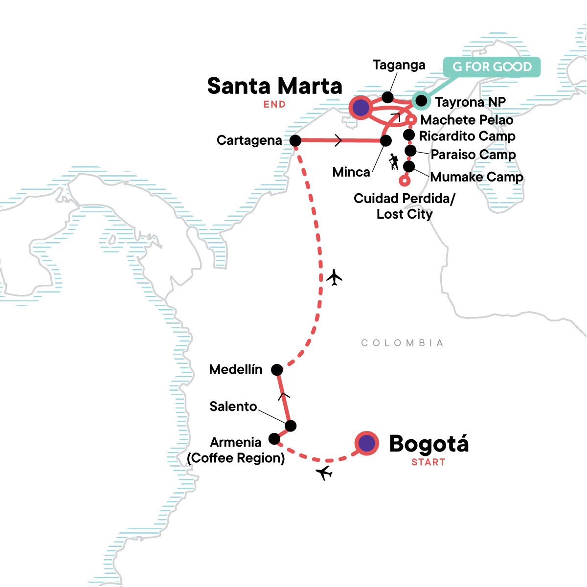 Discover the different neighbourhoods of Bogotá, Savour the tastes and aromas of Colombian coffee, Learn about the history of Medellín, Relax on the beach in Santa Marta, Hike to the Lost City, Spend time with the Katanzama Indigenous community, Discover the beauty in Tayrona National Park