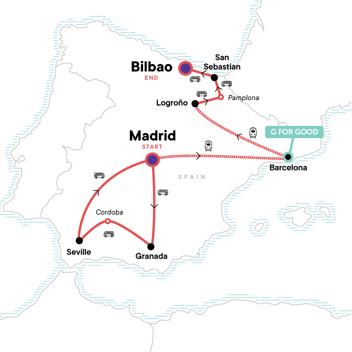 Your Foodie Moment: Pintxos (Tapas) Experience, Logroño. Orientation walks in Madrid, Granada, Barcelona, San Sebastian and Bilbao. Albaicin quarter visit. Alhambra guided tour. Mezquita Mosque and Jewish quarter visit in Cordoba. Flamenco show performance. Hike a portion of the Camino de Santiago from Obanos to Puente la Reina. Entrance and visit to the royal palace of Olite. Visit Pamplona. All transport between destinations and to/from included activities.