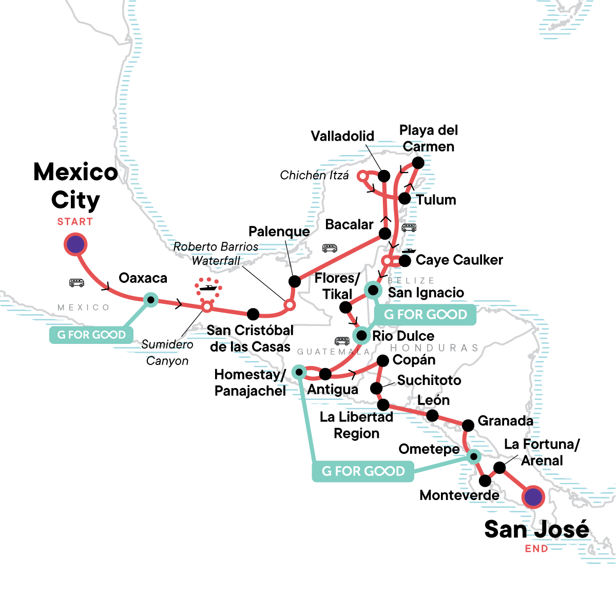 Your Discover Moment: La Fortuna. Mexico City street food crawl. Alebrijes Artisan Community visit. Boat trip to Sumidero Canyon. Stop at Roberto Barrios Waterfall for a swim. Tour the Mayan ruins in Palenque. A catamaran adventure into a gorgeous lagoon in Bacalar. Chichen Itzá ruins guided tour. Guided tour of Tikal. Orientation walk in Antigua, Leon, and Granada. Beach time in Playa del Carmen and Caye Caulker, and El Tunco. Free time in Mexico City, Oaxaca, Palenque, San Cristóbal de las Casas, Playa del Carmen, Caye Caulker, and Antigua, Granada, Ometepe, Monteverde, and La Fortuna. All transport between destinations and to/from included activities.