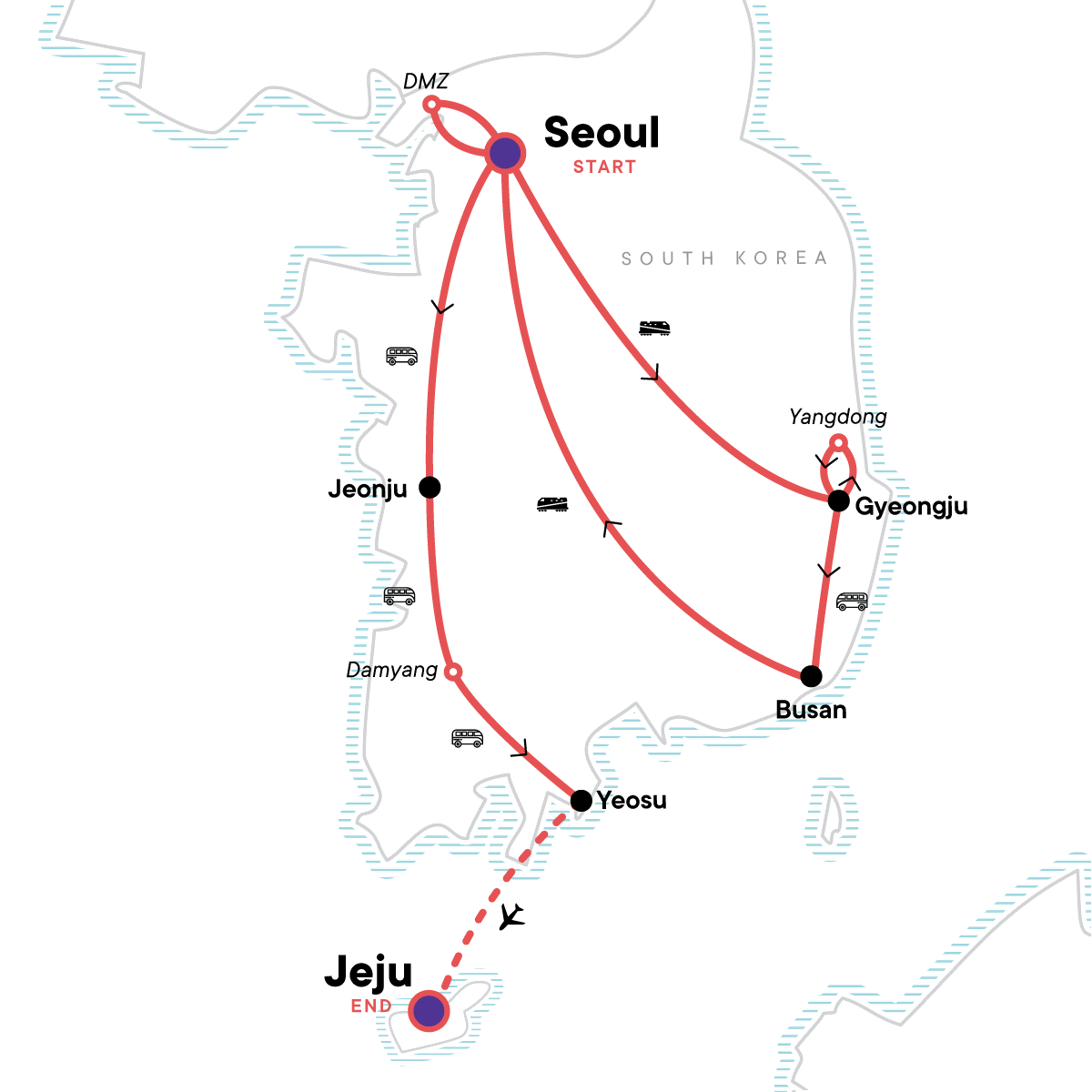 Your Foodie Moment: Hanjeongsik Traditional Dinner, Jeonju. City tour of Seoul. DMZ visit. City tour of Gyeongju. Yangdong Folk Village visit. Haedong Yonggungsa Temple Visit. City tour of Busan. Haeundae Beach and Dongbaek Island (APEC House) Visit. N Seoul Tower Visit. Namdaemun Market Visit. All transport between destinations and to/from included activities. Damyang Bamboo Forest. Boseong Green tea field. Yeosu Cable Car Ride. Visit to Yeosu Art Land. Explore Seongsan Sunrise Peak. Visit Seongeup Folk Village. Tour of Yongmeori Coast & Mt. Sanbang. Visit Cheonjiyeon Waterfalls. Explore Shoesokkak Estuary. Free time in Seoul. Transport to/from included activities.
