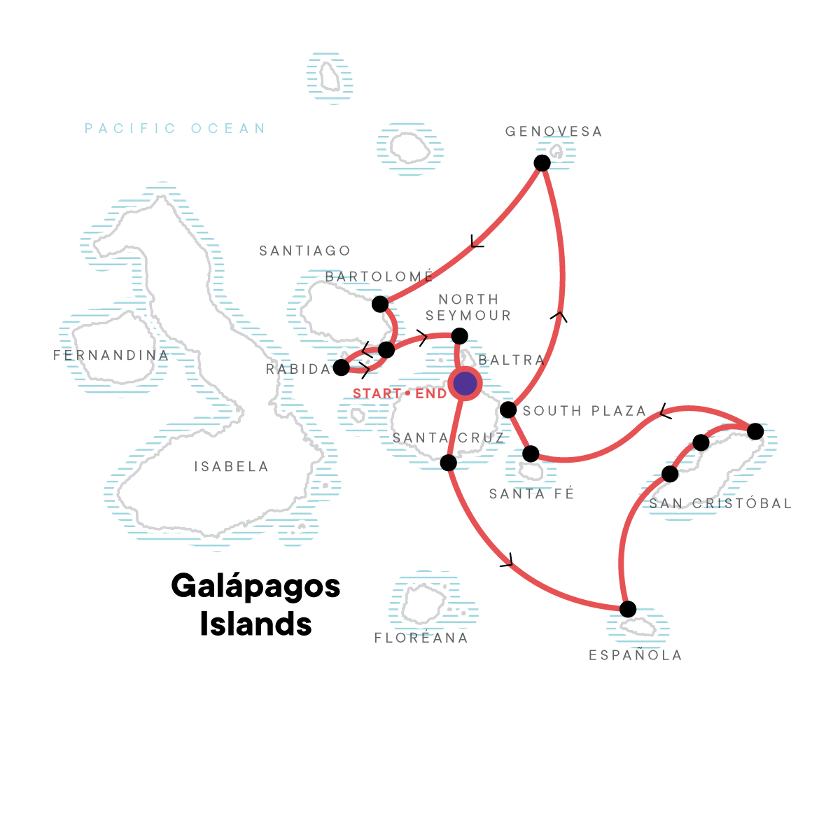 Cruise the Galápagos Islands aboard the Reina Silvia Voyager (7 nts). All meals aboard the Reina Silvia Voyager. Certified Galápagos National Park Service Guide. Snorkelling at Gardner Bay, Sullivan Bay and Bartolomé. Possibility to snorkel or kayak at Santa Fé, Darwin Bay, Rábida and Chinese Hat. Hike to the Bartolomé Island viewpoint overlooking the famous Pinnacle Rock. Incredible wildlife encounters throughout. Highlands and wild tortoise excursion (Santa Cruz Island). Visit to the Charles Darwin Research Station (Santa Cruz Island). All landings and excursions. Onboard snorkelling equipment and wetsuits.