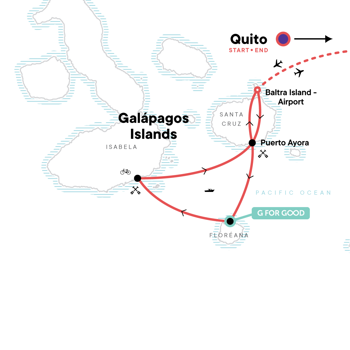 Your G for Good Moment: Floreana Community Guesthouse, Floreana Island. Visit to the Charles Darwin Research Station (Santa Cruz Island). Highlands and wild tortoise excursion. Snorkel excursion Tortuga Bay. Snorkelling at Black Beach and Loberia (Floreana Island). Biking excursion (Isabela Island). Sierra Negra Volcano hike. Giant Tortoise Breeding Centre visit. Internal flights. All transport between destinations and to/from included activities.
