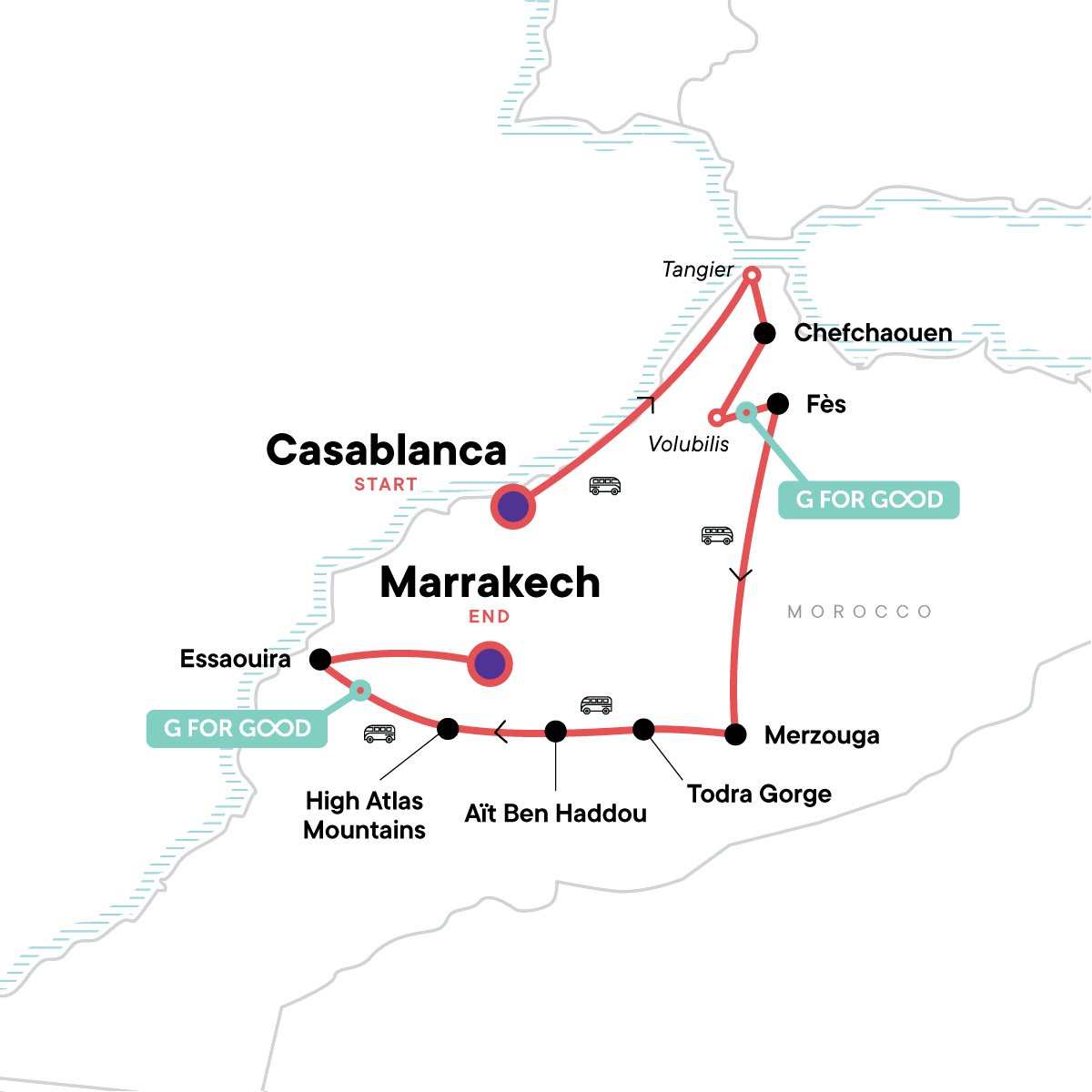 Arrive at any time. Please note that this tour does not spend any time in Casablanca.
