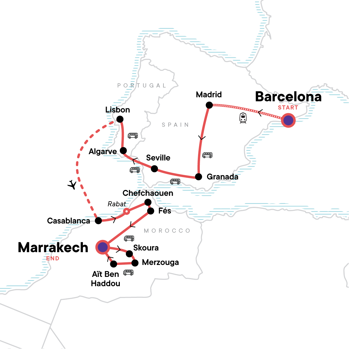 Your Big Night Out Moment: Lisbon. Tapas bar crawl (Granada). Orientation walks in Barcelona, Madrid, Granada, Seville, and Lisbon. Enjoy free time in Rabat. Explore the blue city of Chefchaouen. Visit the medina and souks of Fès. Discover the bustling city of Marrakech. Dades Gorge walk. Camel ride in the desert. Traditional dinner and drums under the stars. Sand boarding in the desert dunes. Aït Ben Haddou kasbah tour. Guided medina visit in Marrakech. All transport between destinations and to/from included activities.