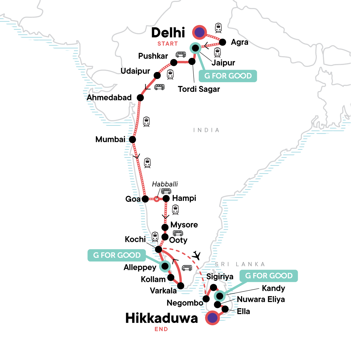Your Big Night Out Moment: Hikkaduwa Beach Bar, Hikkaduwa. Guided tour of the Taj Mahal and the Amber Fort. Orientation walks in Jaipur, Pushkar, Udaipur, and Mumbai. Visit to Gandhi Ashram. Village walk in rural Tordi Sagar. Sunrise at Savitri temple. Free time in Hampi, Ooty. Hampi Ruins Walking Tour. Anjaneya Temple Sunset. Devaraja Market Visit. Chamundi Hills Visit. Monolithic Bull Visit. Dodapetta Peak. Dodapetta Tea Factory. Fort Kochi Visit. Orientation walks in Alleppey, Kollam, and Fort Kochi. Morning ferry cruise on Alleppey's backwaters. Sri Lankan lunch at a local village. Spice garden visit. Tea plantation tour. Little Adam's Peak Tour. Galle Fort tour. Internal flight. All transport between destinations and to/from included activities.