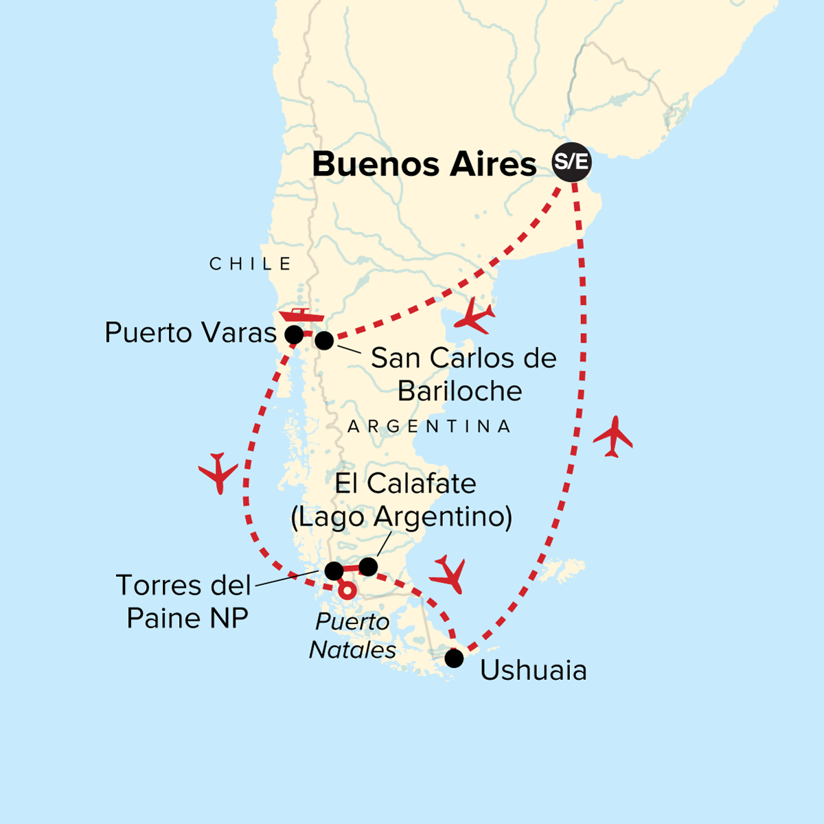 Your Discover Moment: San Carlos de Bariloche. Arrival transfer. Bariloche Circuito Chico tour. Scenic lake crossing aboard the "Cruce de Lagos". Excursion into Torres del Paine National Park. Guided tour to the Perito Moreno Glacier. Buenos Aires city tour. Internal flights. All transport between destinations and to/from included activities