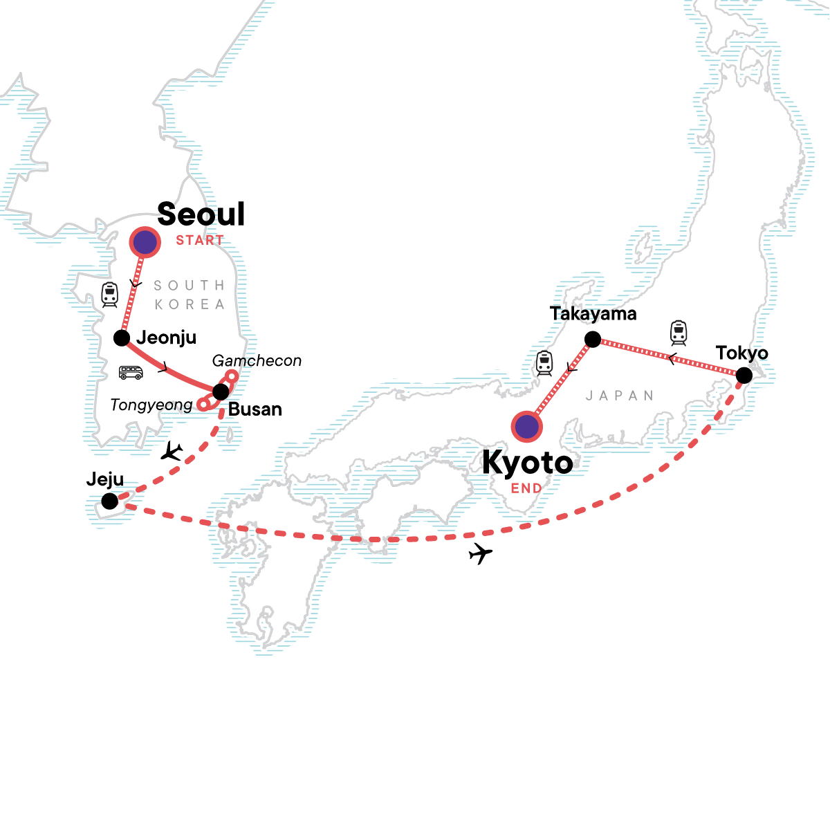Visit HiKR Ground in Seoul, Take in colorful Gamcheon village on a walking tour, Watch the Haenyeo of Jeju Island, Explore lively Tokyo, spend a night in a traditional Minshuku (japanese inn), travel to culturally-rich Kyoto
