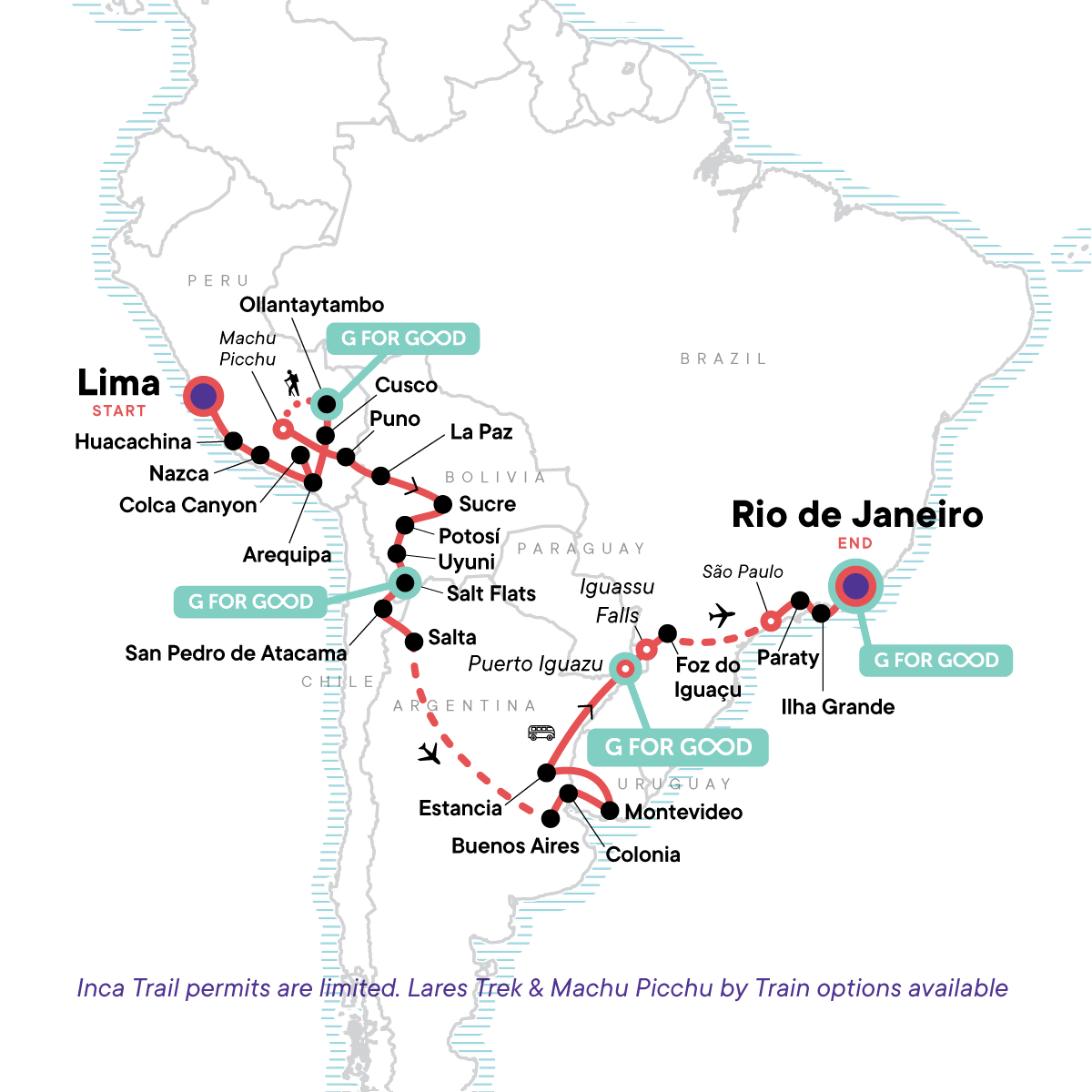 Your Discover Moment: Rio de Janeiro. Sunset sandboarding & dune buggies (Huacachina). Pachamanca-style dinner (Nazca). Colca Canyon excursion. Inca Trail hike with a local guide and cook (4 days). Guided tour of Machu Picchu. Lake Titicaca excursion. Salar de Uyuni (Uyuni Salt Flats) excursion (3 days). Entrance and visit to Iguassu Falls. Internal flights. All transport between destinations and to/from included activities.