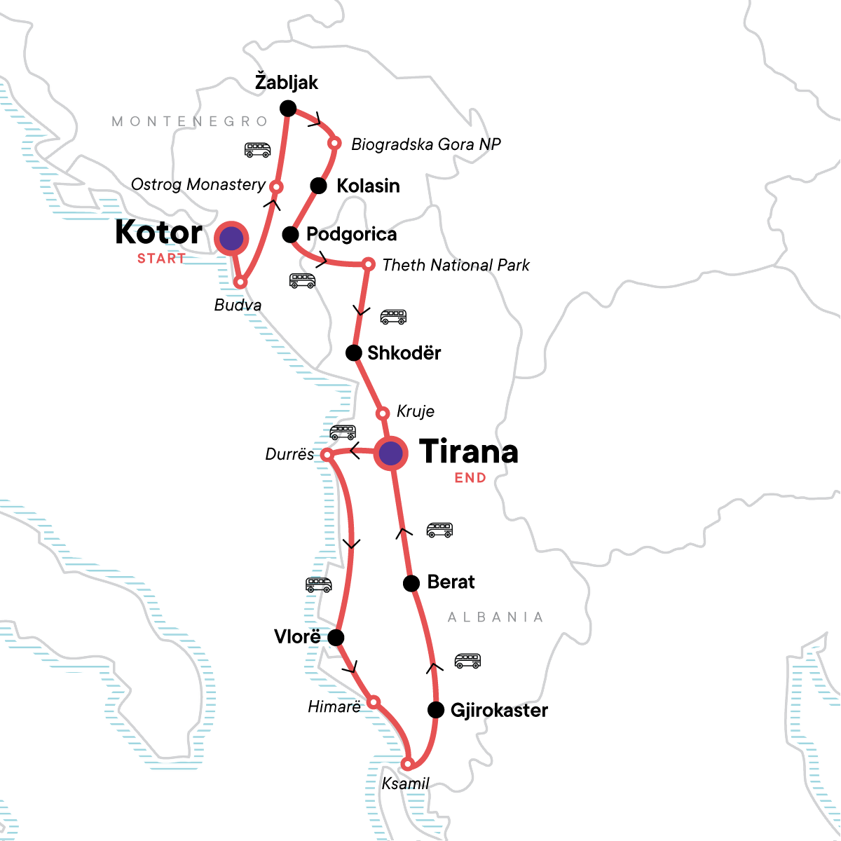 Your Foodie Moment: Gjirokastër Winery Visit and Light Dinner, Gjirokastër. Kotor orientation walk. Boat tour from Kotor to Perast. Budva Old Town walk. Visit Ostrog Monastery. Full-day excursion to Biogradska Gora National Park. Kolašin 4x4 Off-Road Excursion. Orientaion walk of Podgorica. Theth National Park visit. Walking tour of Shkoder. Walking tour of Kruje. Evening orientaion walk of Tirana. Tour of the Durrës archaeological site. Orientation walk of Vlorë. Visit Himare. Entrance to the Ali Pasha Castle. Visit Butrint National Archaeological Park. Walking tour of Gjirokastër. Walking tour of Berat. Farewell Dinner. Transport to/from all included activities and between all destinations.