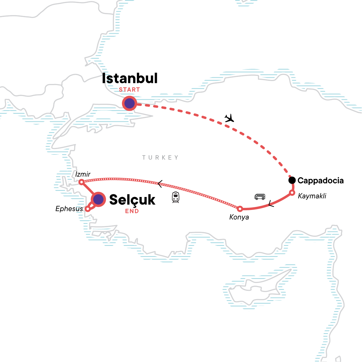 Me Day: Cappadocia Me Day, Cappadocia. Complimentary arrival transfer. Walking tour of the historic heart of Istanbul. Walk through Istanbul's Grand Bazaar. Visit the Goreme Open Air Museum in Cappadocia. Pottery experience in the town of Avanos. Explore the Kaymakli Underground City. Visit the Mevlana Museum and mausoleum of Mevlana Rumi in Konya. Walk through the Agora and the Kemeralti Old Bazaar in Izmir. Guided walking tour of Ephesus. Village-to-village hike from Çile to the coast. Fruit wine tasting and farewell dinner. All transport between destinations and to/from included activities.
