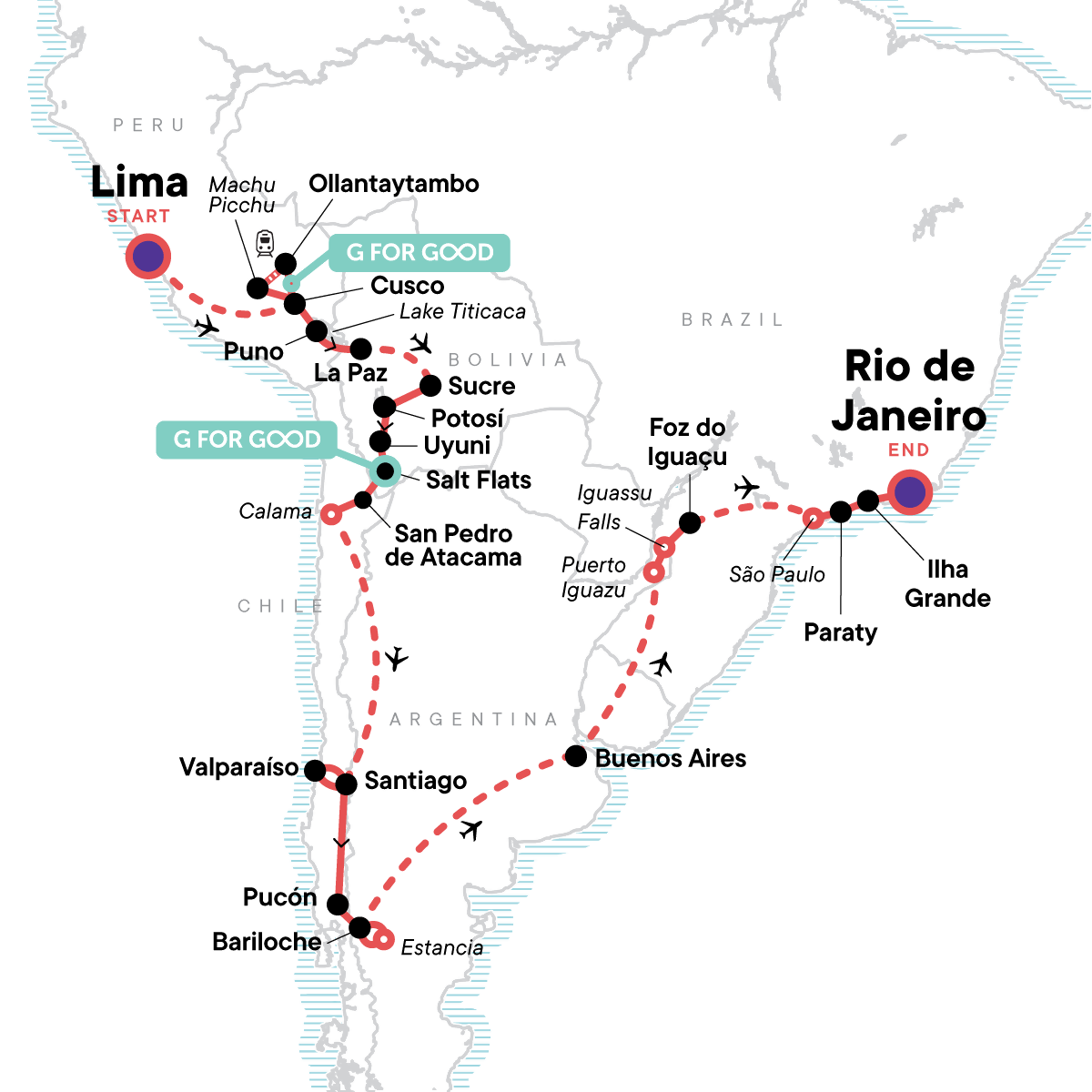 Explore the Sacred Valley on a visit to community projects in the highlands, Witness the unforgettable views of Machu Picchu, Take the train through the scenic Urubamba Valley to Aguas Calientes, Witness traditional life on Lake Titicaca, Cross the world's largest salt flat by 4x4 at the Salar de Uyuni, Enjoy an included excursion to the Valley of the Moon to cherish the uniqueness of the environment, Explore colourful Valparaíso, Enjoy the nightlife in Buenos Aires, Stand in awe of Iguassu Falls, Sip a caipirinha in Rio, Explore the cobblestoned streets of colonial Paraty