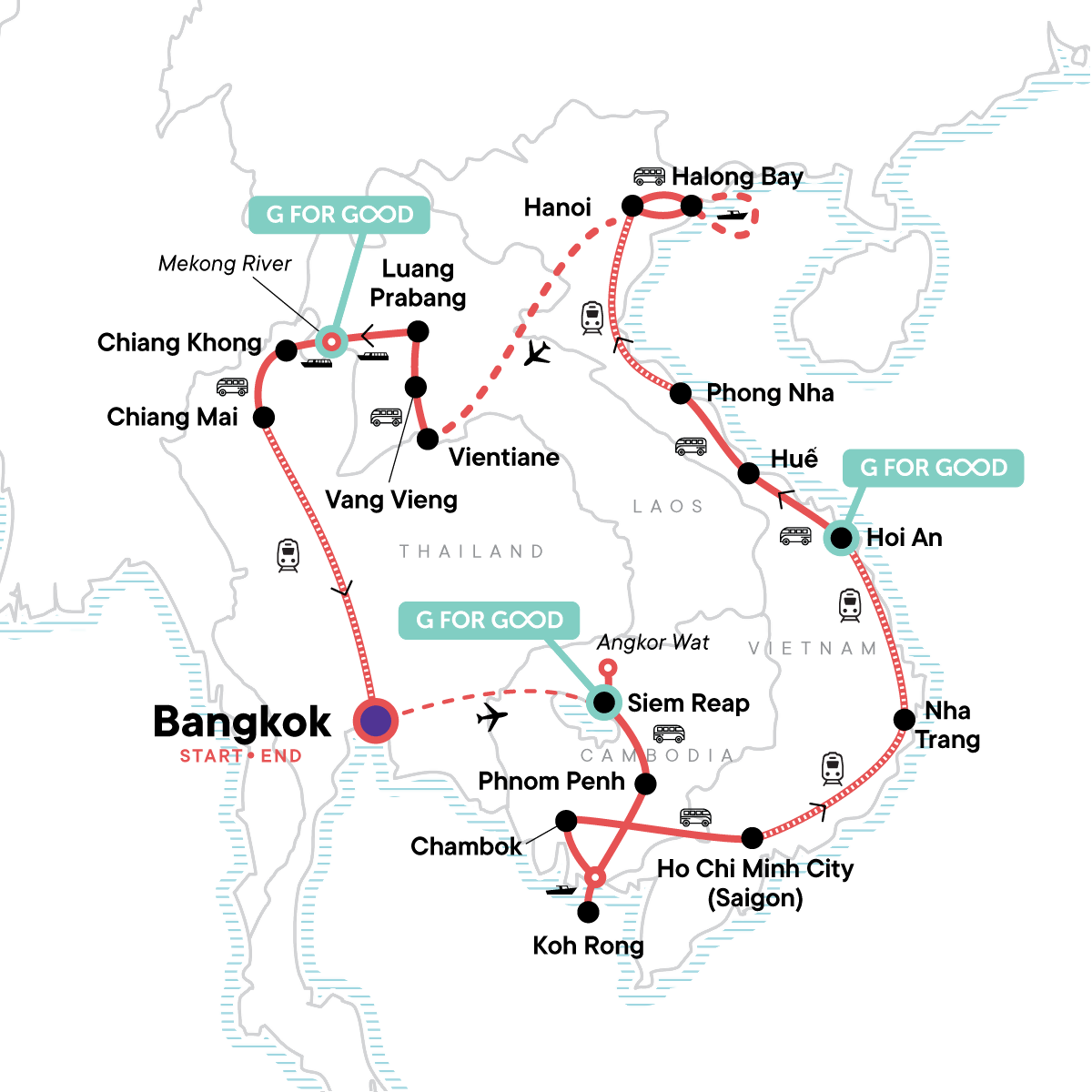 Your Big Night Out Moment: Bangkok. Guided sunrise tour of Angkor Wat temple complex. Orientation walks in Ho Chi Minh City, Hoi An, Hanoi, Phnom Penh, and Luang Prabang. Halong Bay boat cruise with lunch. Guided hike to Wat Phousi at sunset and Kuang Si waterfall excursion in Laos. Slow boat up the Mekong. Three street food crawls in different cities. Internal flight. All transport between destinations and to/from included activities.