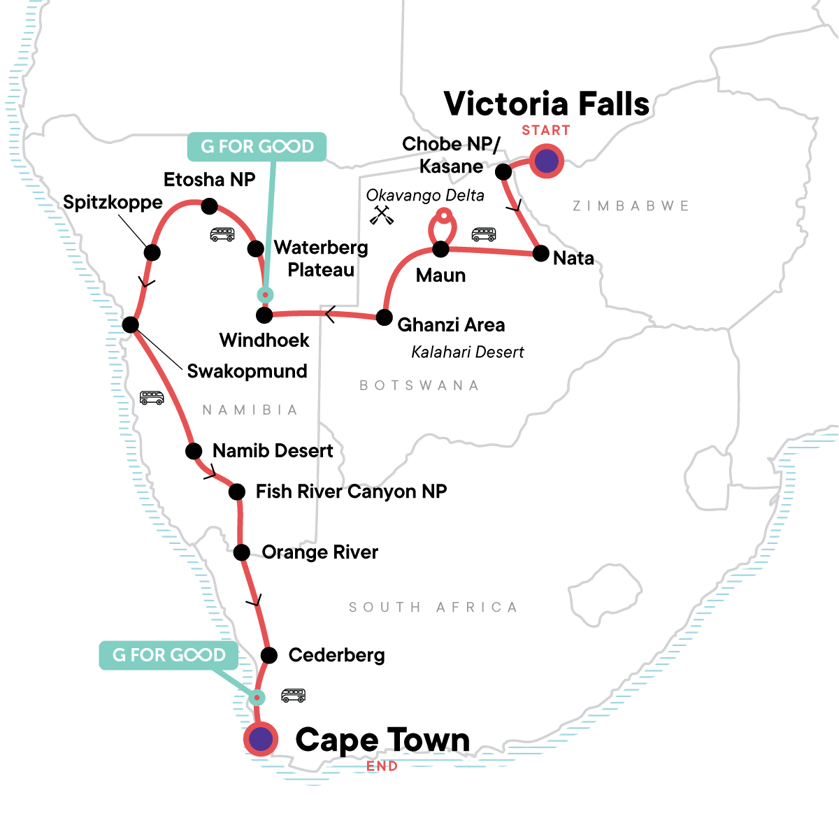 Track the Big Five, feel the mist of Victoria Falls, cruise the Chobe River at sunset, camp in African wilderness, meet the San people, get your heart pumping with adrenaline activities, soak up Cape Town's culture