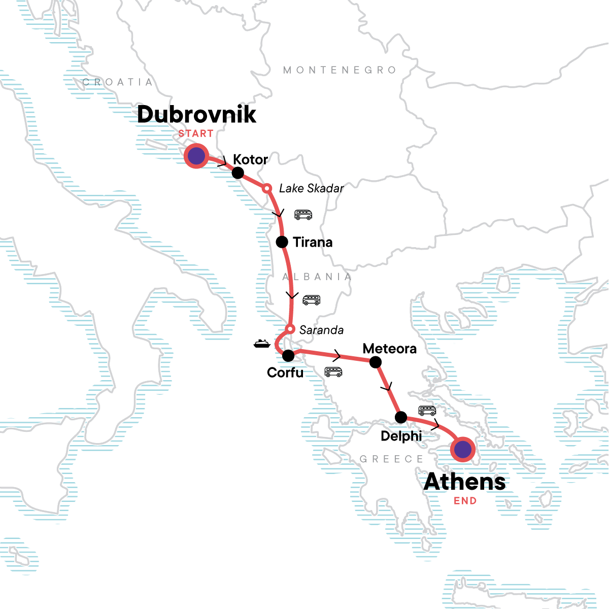 Your Welcome Moment: Welcome Moment - Meet Your CEO and Group. Scenic drive along Kotor Bay. Walk to Kotor fortress at sunrise. See Skadar Lake. Take advantage of a free day in Corfu. Visit the magnificent Monasteries in Meteora. Experience the Delphi Ancient Ruins with your CEO. Embark on a highlights walk of Athens. Grab a drink at a G Adventures-supported café. Enjoy free time in major cities along the way. All transportation between destinations. 24 hour metro passes in select cities.