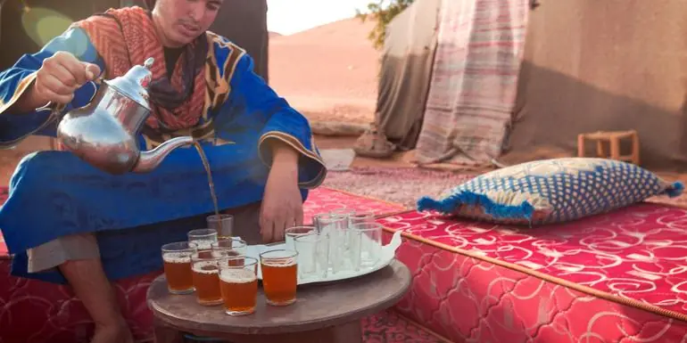 Wake up to a stunning sunrise, enjoy some breakfast at camp and then start the day. This is our second day of the Berber desert journey. Then you have a choice of walking or riding a camel to our lunch stop. Enjoy the sights and sounds of the Sahara as you travel like people have for millenniums. After lunch we’ll enter the 21st century again and travel to the next desert camp by 4x4. Arrive at the oasis of Bertam to catch sunset before having dinner fireside with stories and music.