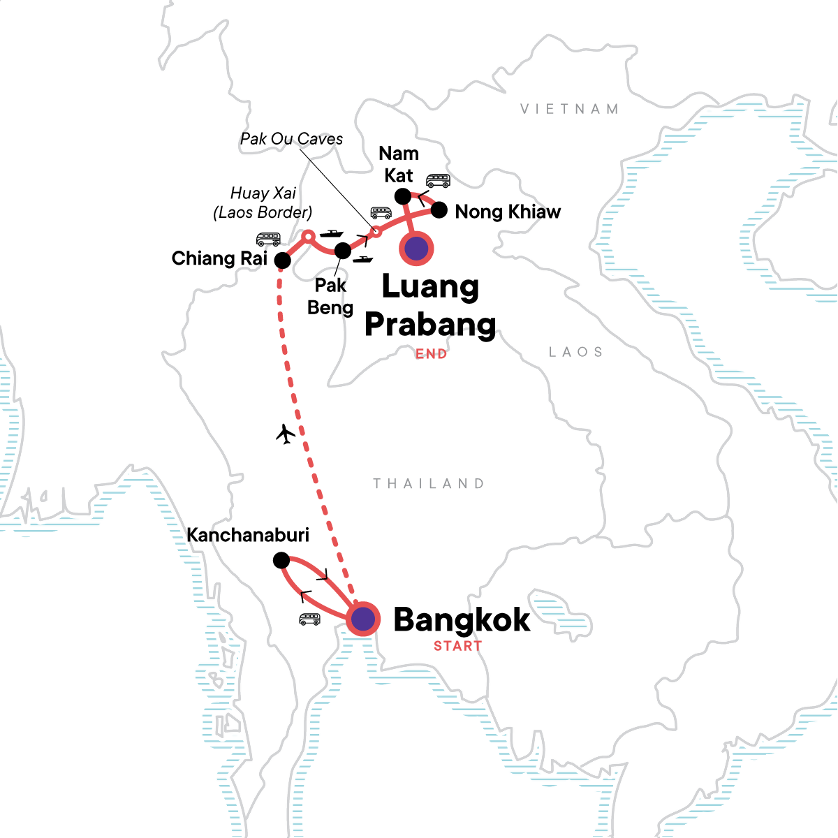 Your Discover Moment: Luang Prabang. Complimentary Arrival Transfer. Bangkok Dinner Cruise. Hellfire Pass and Thai-Burma Railway Centre explorations. Floating accommodation in Kanchanaburi. Chiang Rai street food tour. 2-day slow-boat along the Mekong. Som Nang Viewpoint hike. Cultural Immersion at Nayangtai village in northern Laos. Canopy Hanging bridges of Nam Kat. Alms giving in Luang Prabang. Internal airfare. Tips are included for all included meals and activities, except for CEO and porterage. All transport between destinations and to/from included activities.
