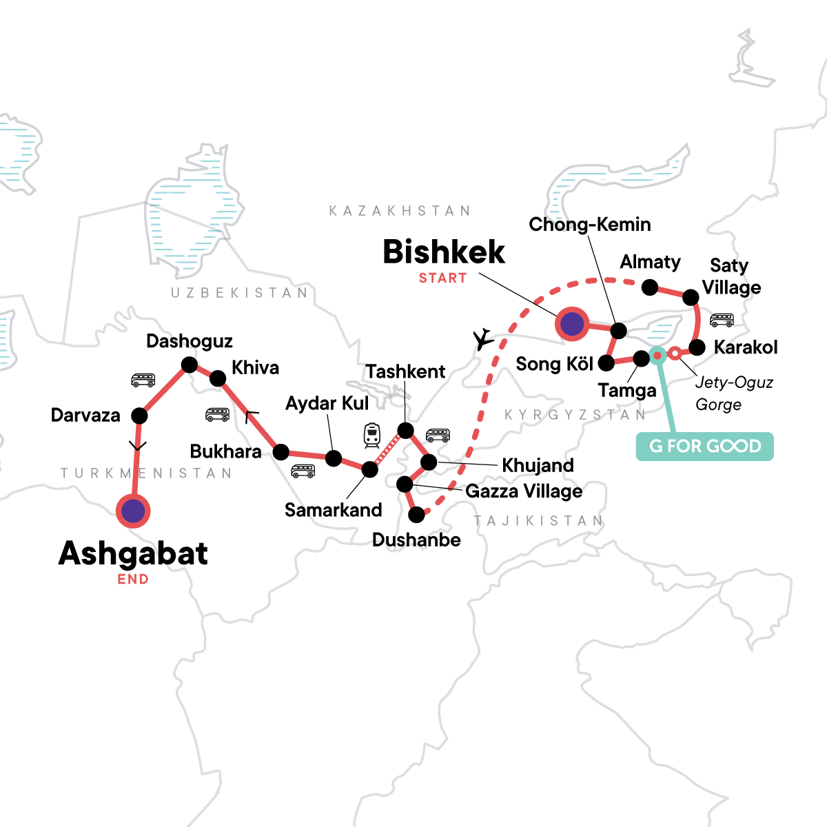 Your Local Living Moment: Overnight in a Yurt, Aydar Kŭl Camp. Bishkek City Tour. Burana Tower. Home-cooked traditional dinner. Overnight in a Yurt. Free time in Chong-Kemin. Song Kul Lake. Lunch with Local Family in Kochkor. Skazka "Fairytale" Canyon. Tamga Village Stay. Yurt Building Demonstration. Jety Oguz & the Seven Bulls. Karakol City Tour. Russian Orthodox Cathedral. Dungan mosque. Saty Village Stay. 4x4 ride to Kaindy Lake. Charyn Canyon. Almaty City Tour. Independence Square, Zenkov Cathedral, Panfilov's Park. WWII memorial. Free time in Almaty. Dushanbe City tour. Alexander the Great's lake. Hike to Iskander Darya waterfall. Fann Mountains. Voru Village Hike and Blacksmith. Free time in Ghazza Village. Istaravshan Mosque and Lenin Bust visit. Khujand City Tour. Museum of Sughd. Mausoleum of Sheik Muslekheddin. Khujand market. Amir Timur Mausoleum Visit. Samarkand City Tour. Shaki Zinda complex, the bazaar, Bibi Khanum, and Registan Square. Free time in Samarkand. Chashma Complex and Holy Spring Visit. Fortress of Alexander the Great Visit. Aidarkul Lake. Authentic Uzbekistan dinner. Evening Kazakh singing show. Overnight in a Yurt. Free time in Bukhara. Bukhara City Guided Tour. UNESCO-listed Khiva Ancient City Exploration. Free time in Khiva. UNESCO World Heritage Site Kunya Urgench. Guided tour of Dashoguz City. Gorogly Monument. Dashoguz Wedding hall. Kara-Kum desert. Fiery Darvaza gas crater, "Gates of Hell”. Mud Crater Visit. Sand Dunes of Karakum Desert. Ashgabat City Tour. Monument of Independence. National Museum of History and Ethnography. Arch of Neutrality. Gulistan market. Ancient Settlement of Nisa. Free time in Ashgabat. Tashkent Guided City Tour. Free time in Tashkent.
