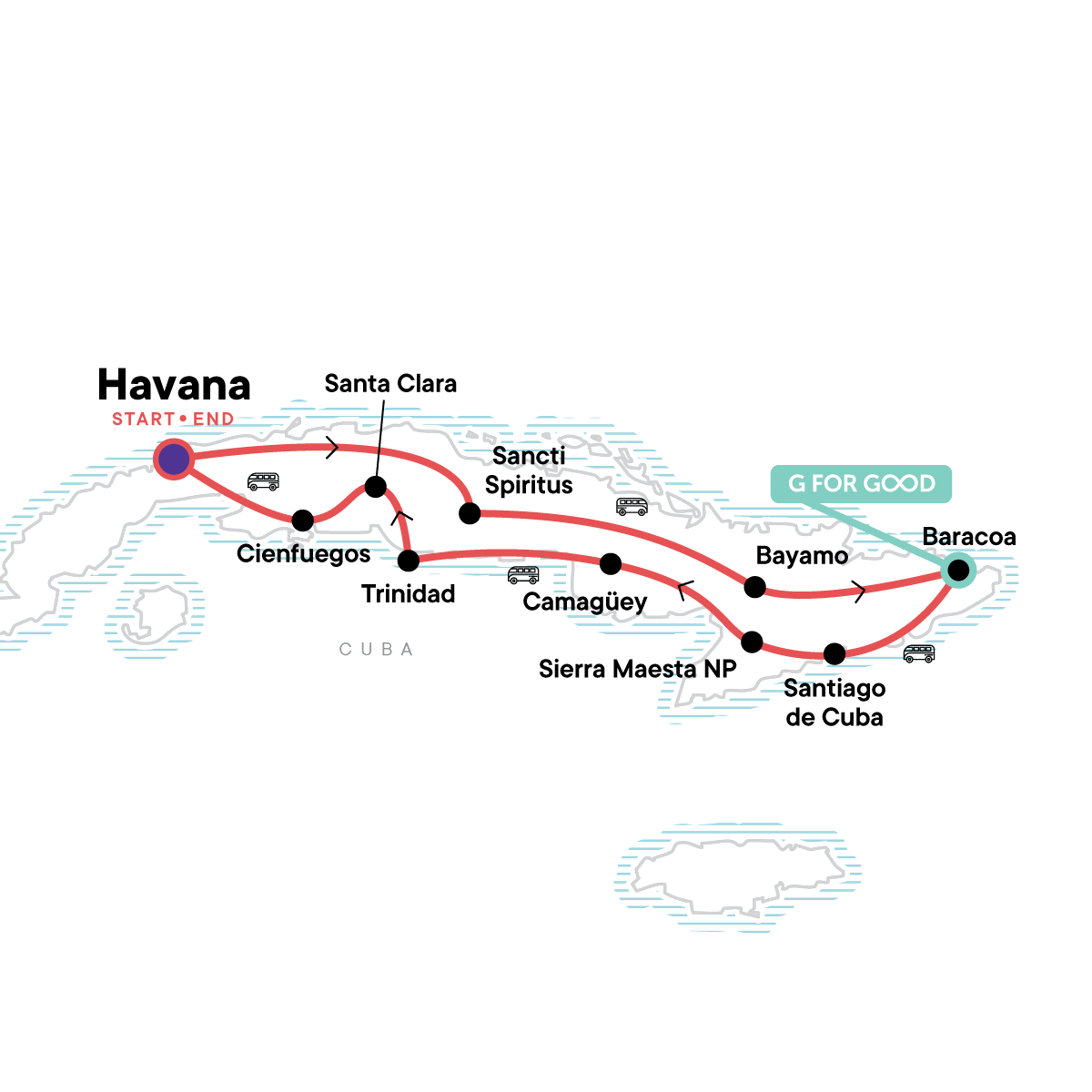 Your Hands-On Moment: Salsa Lesson, Trinidad. Arrival transfer. Che Guevara mausoleum and museum visit. Beach time in Baracoa. Comandancia de la Plata hike. Havana city tour in vintage car. Old Havana walking tour. Orientation walks in Sancti Spíritus, Santiago de Cuba, Baracoa, Camagüey, Cienfuegos, and Trinidad. Free time in Bayamo, Santiago de Cuba, Trinidad, Bay of Pigs, and Havana. Informal Spanish lesson. All transport between destinations and to/from included activities.