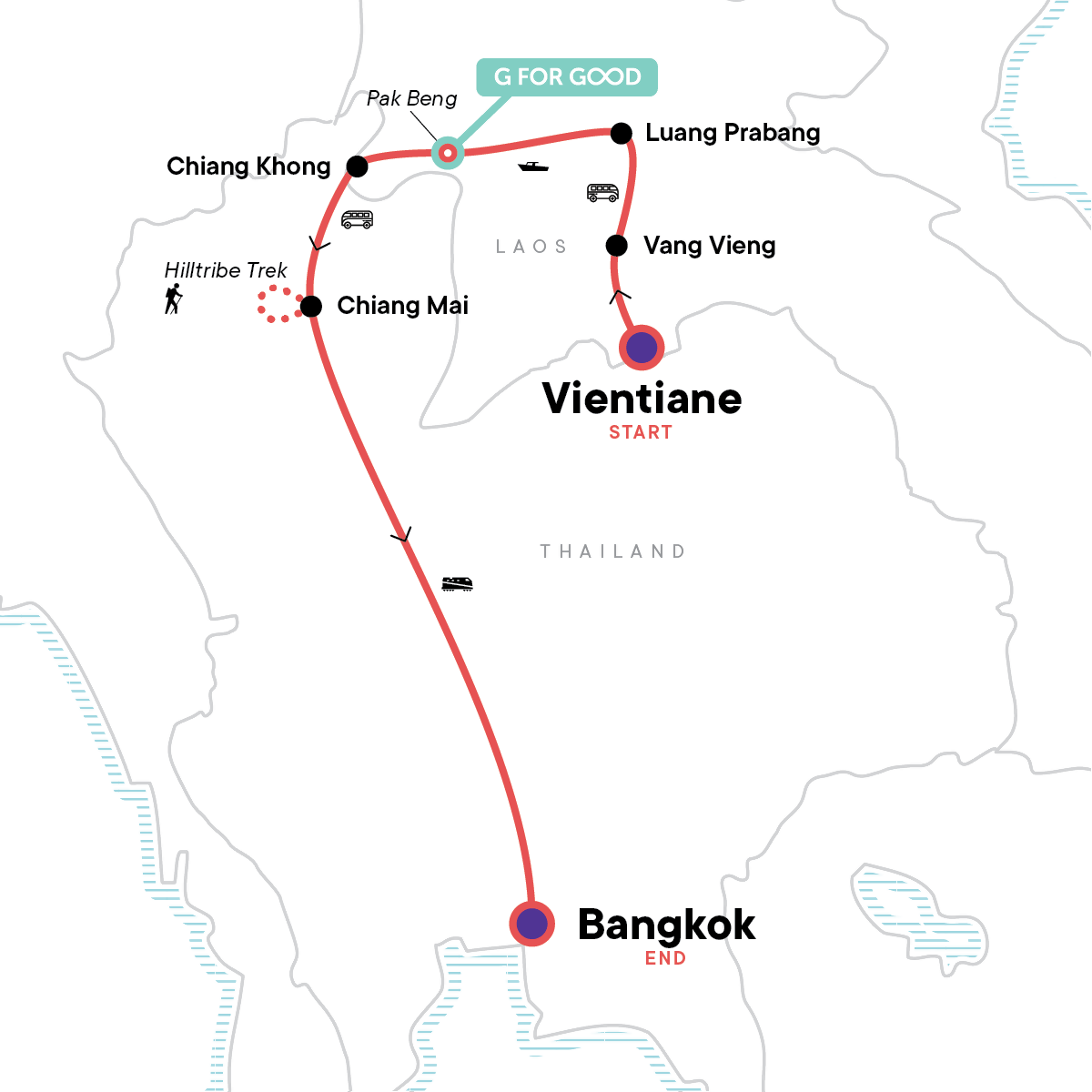 Your Big Night Out Moment: Chiang Mai Celebration, Chiang Mai. Guided hike in Vang Vieng. Slow boat up the Mekong. Orientation walk, Wat Phousi sunset trek, Kuang Si Waterfalls excursion and street food crawl in Luang Prabang. Hilltribe trek. Bamboo rafting. All transport between destinations and to/from included activities.
