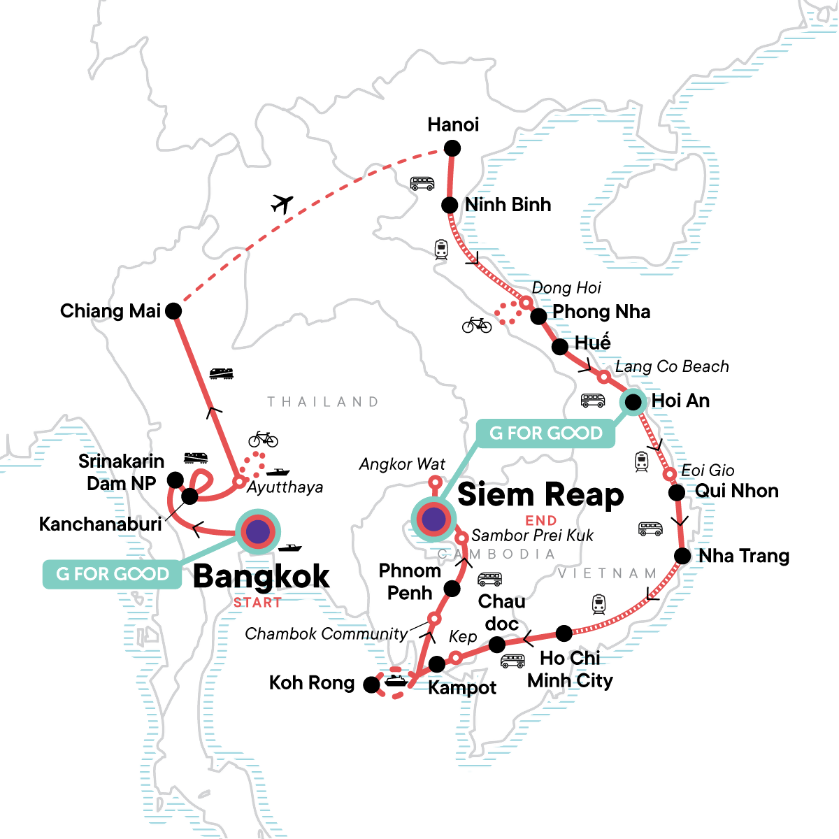 Your Foodie Moment: Ho Chi Minh City Street Food Crawl, Ho Chi Minh City. Bangkok tuktuk & Street Food Dinner in Chinatown. Bangkok Klong Riverboat Tour. Kanchanaburi tour. Hellfire Pass. Ride the Death Railway. Bridge on the River Kwai. Thai/Burma Railway Centre and Allied War Cemetery. Visit a Local Rice Farm in Kanchanaburi. Ayutthaya Cycling & Boat Tour. Tuktuk ride in Ayutthaya. Overnight train from Ayutthaya to Chiang Mai. Chiang Mai Old Town Orientation Walk. Street Food Walk at Chiang Mai Night Market. Sunrise Alms Giving & Doi Suthep temple visit. Hanoi Cyclo Tour. Bia Hoi Corner and Microbrewery Crawl. Hanoi Foodie Culture Tour. Tam Chuc Pagoda Tour. Dong Hoi Wet/Fish Market & countryside cycling. Vinh Moc Tunnels Visit. An Bang Cemetery Tour. Hai Van Pass & Marble Mountain Tour. Hoi An Old Town Walk and Riverside Evening Out. Thap Doi Cham Temples Visit. Eoi Gio Coastal Walk. Visit Gành Đá Dĩa. Nha Trang Mud Bath Visit. Ho Chi Minh City Walking Tour including Ben Thanh Market. Karaoke Night in Ho Chi Minh City. Street food crawl in Ho Chi Minh City. Sam Mountain Excursion by Motorbike. Sunrise boat trip in Châu Đốc. Kep Market Visit with Lunch (Cambodia). Monivong Bokor National Park Visit (Kampot). Chambok Community Visit and Lunch. Cyclo ride around Phnom Penh + dinner at a good local restaurant. Visits to Skun Market and Santuk Silk Farm. Tour of Sambor Prei Kuk Anicent Site. Visit Rong Klua Market. All transport between destinations and to/from included activities.