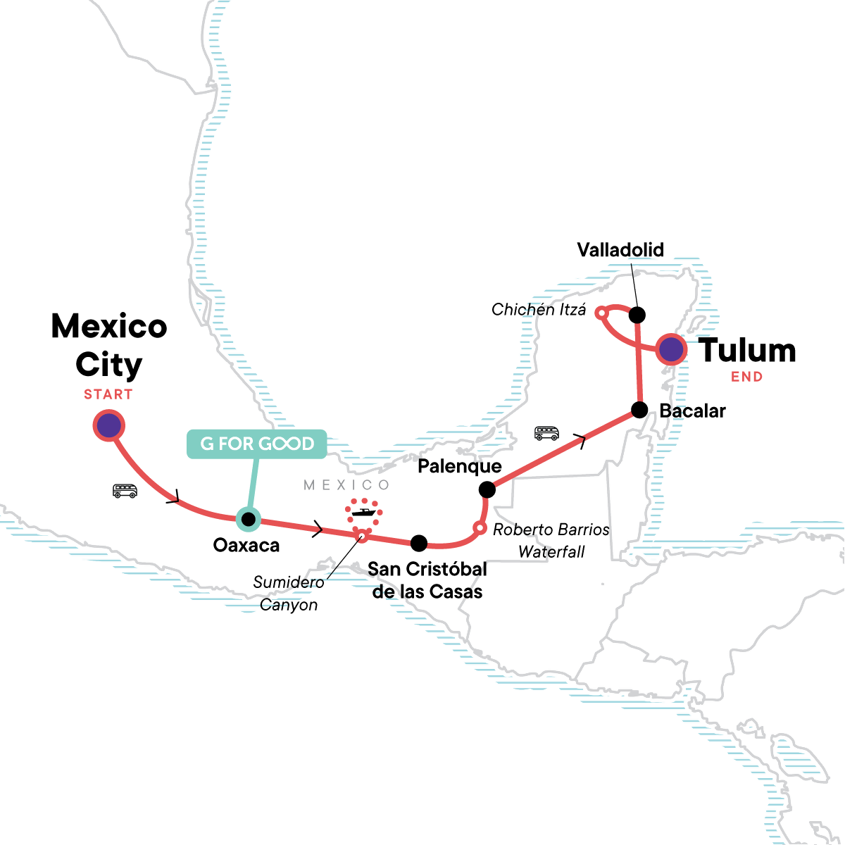 Your Big Night Out Moment: Tulum. Mexico City street food crawl. Alebrijes Artisan Community visit. Boat trip to Sumidero Canyon. Stop at Roberto Barrios Waterfall for a swim. Tour the Mayan ruins in Palenque. A boat adventure into a gorgeous lagoon in Bacalar. Chichen Itzá ruins guided tour. Free time in Mexico City, Oaxaca, Palenque, San Cristóbal de las Casas. All transport between destinations and to/from included activities.
