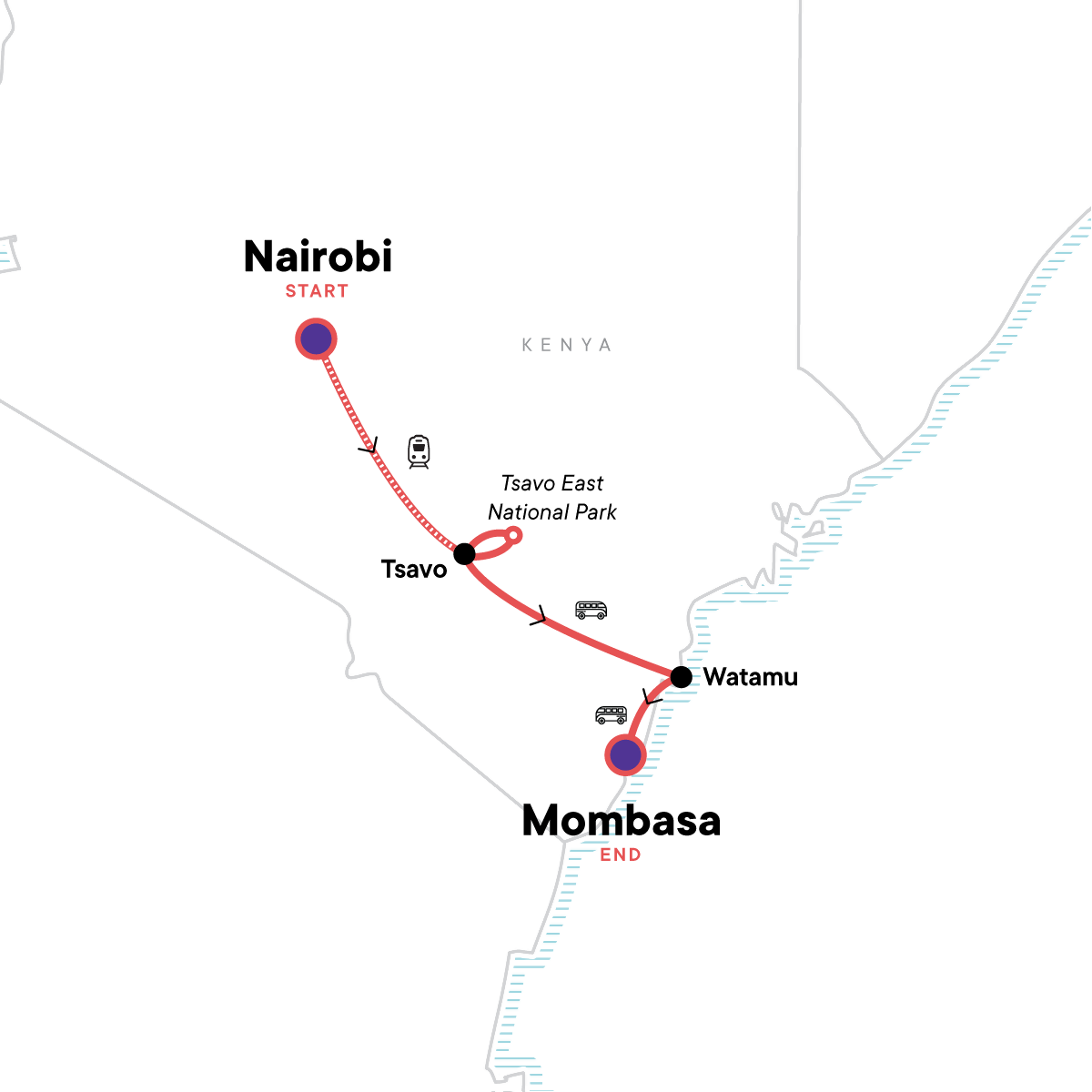 Journey through Kenya on a six-day adventure that blends wild savannahs with coastal charm. Begin in the buzzing capital of Nairobi and ride the legendary “Iron Snake” railway to Tsavo, where red elephants roam and wildlife steals the spotlight on morning and afternoon safaris. Then swap savannahs for seaside in Watamu, a tropical paradise teeming with whale sharks, turtles, and vibrant reefs. Explore the mysterious ruins of Gedi, spice things up with a coastal cooking class, and unwind to the rhythm of the Indian Ocean. End in historic Mombasa, where culture, beaches, and adventure collide to create memories you’ll carry forever.