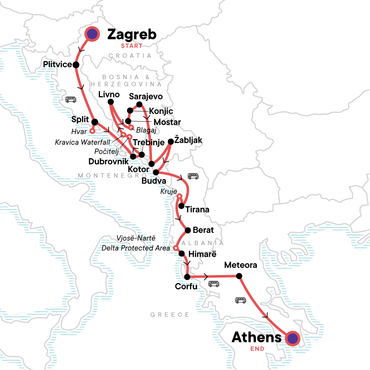 Your Big Night Out Moment: Athens. Orientation walk in Zagreb. Entrance to Plitvice Lakes National Park. Day trip to Hvar. Guided tour of Diocletian's Palace (Split). Evening orientation walk in Split. Tvrdoš Monastery Visit and Wine Tasting. Trebinje orientation walk. Explore the Počitelj Fortress and art colony. Visit Kravica Waterfall. Take a sunset jeep safari in search of wild horses. BBQ dinner and bonfire in Livno. See the Dervish Monastery and explore Blagaj. Guided walking tour of Mostar. Whitewater rafting on the Neretva River with bbq lunch. Orientation walk of Kotor. Hike to Kotor Fortress. Boat tour on the Bay of Kotor. See Nevidio Canyon. Hike to Crno Jezero (Black Lake) in Durmitor National Park. Visit the Ostrog Monastery. Orientation walk of Budva's old town. Orientation walk of Tirana. Explore Kruje on foot. Walking tour of Berat including the castle. Visit the coastal wetlands of the Vjosë-Nartë Delta Protected Area. Walking tour of Himarë. Corfu Trail hike across the island to Benitses. Meteora Monasteries hike from Kalabaka. Orientation walk of Athens. Transport to/from all included activities and between all destinations.