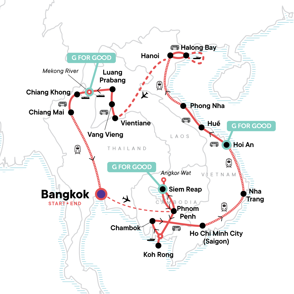 Your Big Night Out Moment: Bangkok. Guided sunrise tour of Angkor Wat temple complex. Orientation walks in Ho Chi Minh City, Hoi An, Hanoi, Phnom Penh, and Luang Prabang. Halong Bay boat cruise with lunch. Guided hike to Wat Phousi at sunset and Kuang Si waterfall excursion in Laos. Slow boat up the Mekong. Three street food crawls in different cities. Internal flight. All transport between destinations and to/from included activities.